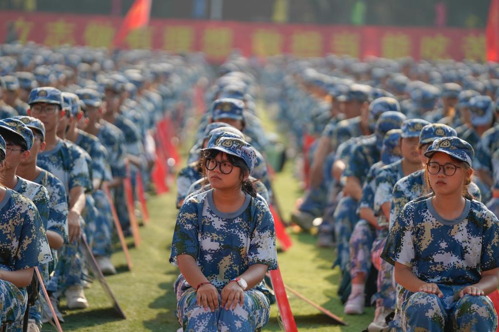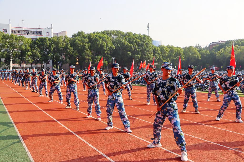 典礼上进行了军事汇报表演。2023级新同学们身着迷彩服,训练有素,英姿飒爽地走过主席台前,队列训练方阵动作整齐划一,匕首操方阵一招一式充满力量,擒敌拳展示刚劲有力……十多天军训的成果,尽显同学们青春风采,赢得阵阵掌声。