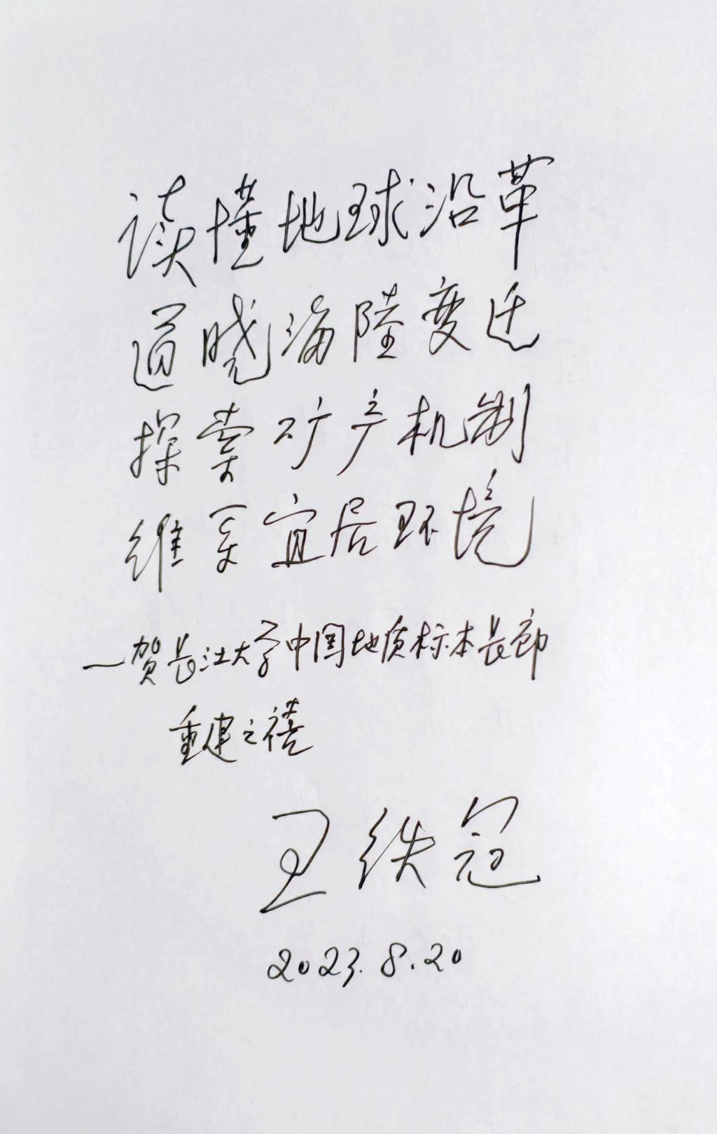 “中国地层标本长廊”是“长江三峡地层标本长廊”的延续与拓展,集中展现了中国南方的扬子板块和北方华北地台的形成、演变与地层记录,体系完整,遥相呼应,王铁冠、邓运华、李阳3位院士对其高度认可,欣然题词表示祝贺。